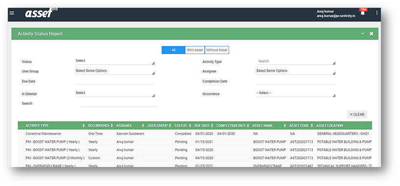 Home Screen > Reports > Schedules & Maintenance > Activity Status Report