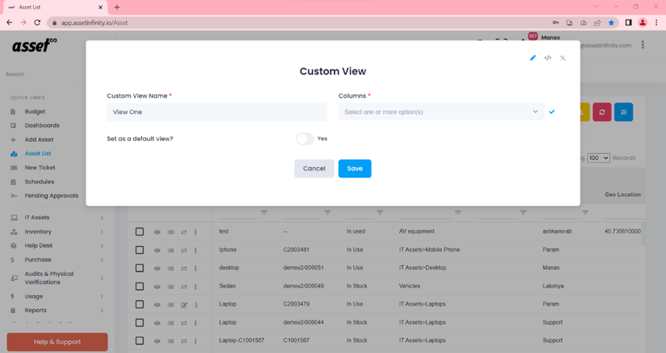 Custom View: As seen in the above screenshot, a user can create a Custom View as per their requirement, in order to view the Asset List in their desired fashion. The users see a Default View which they can then add on to to create a Custom View that they wish to be shown as default as well.