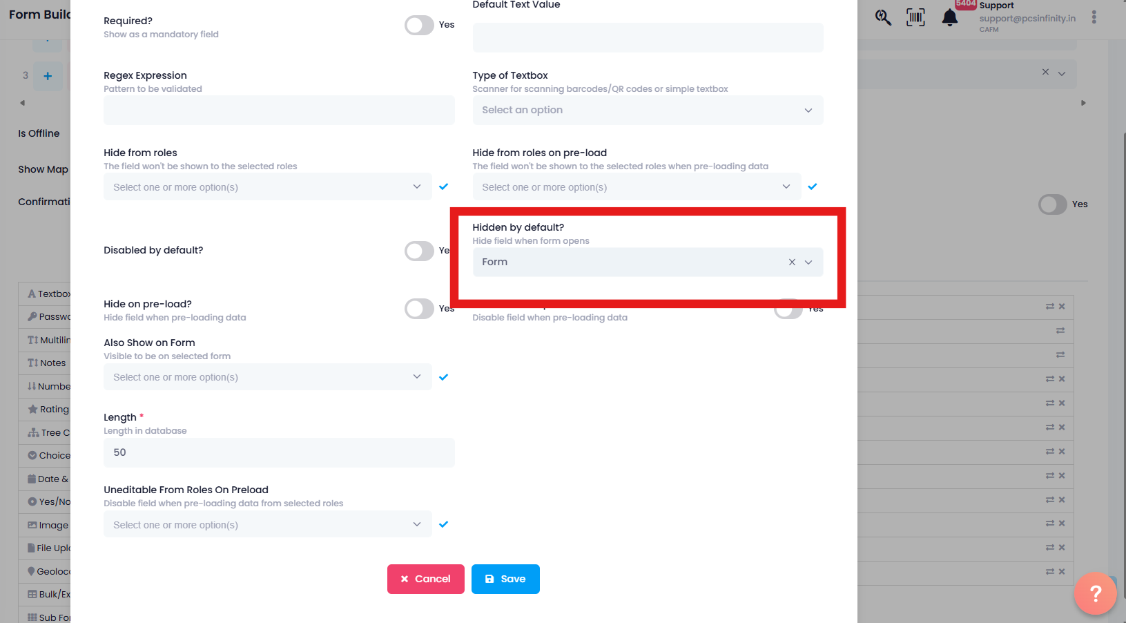 Go to >> Hidden by default option and select "Form" as we have to hide the column on form only.