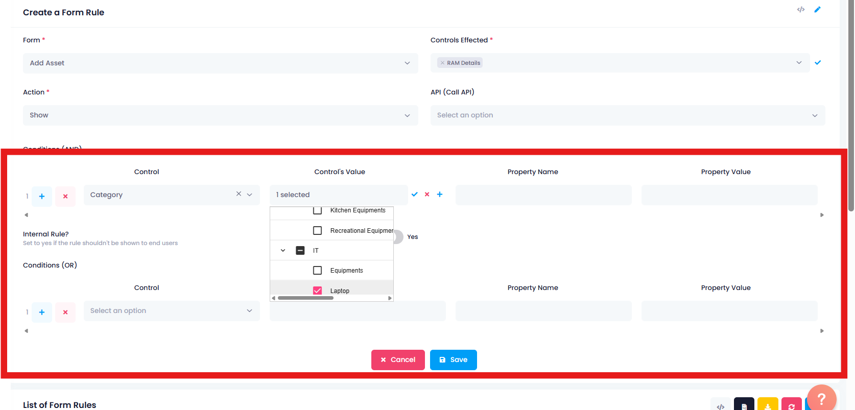 Use this article to add conditional logic so that when a user selects a particular Category on the Add Asset form, only the relevant custom columns (fields) appear. This keeps the form clean and shows only information that matters for that asset type.