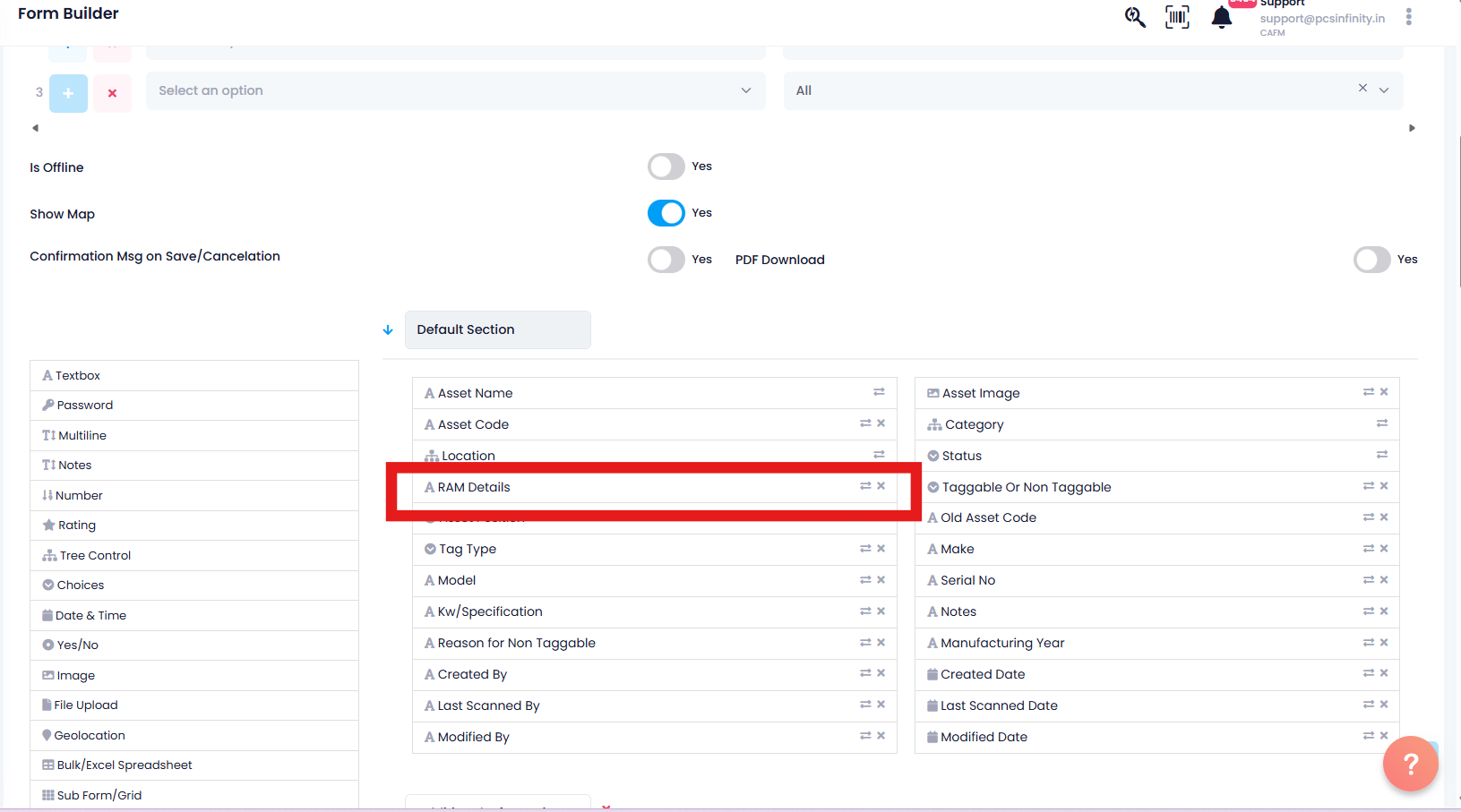 Step 2: Click on the relevent column on form builder, which user want to show on any specific category selction. For ex. there is column "RAM Details" on add asset which should only appears when the category is "IT>Laptop". for other catgeory column "RAM Details" should not appear.