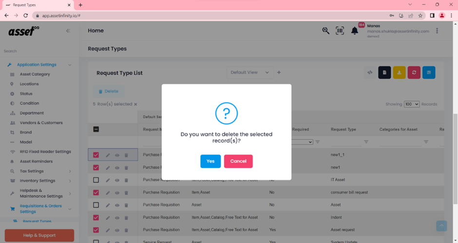 A confirmation pop up will appear. Click on “Yes” to delete multiple request types.