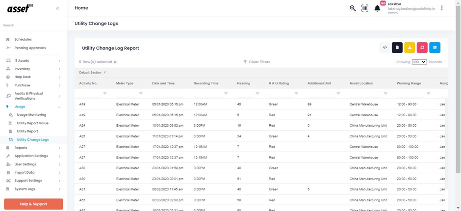 Log in to your asset infinity account and go to usage and then select utility change logs.
