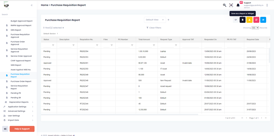 The Purchase Requisition Report feature in Asset Infinity allows you to generate a report that shows the details of all the purchase requisitions (PRs) created in a specified period. Here's how you can use the Purchase Requisition Report feature: