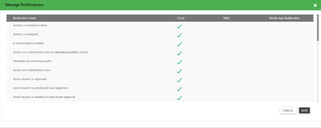 SMS | User can choose SMS medium to be notified for the given list of transactions | User can configure the SMS gateway in the application. (In case user wishes to configure, they can connect with Asset Infinity Support team). |