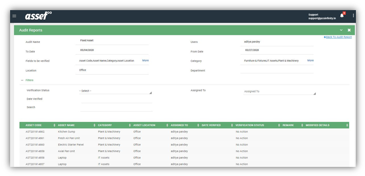 Users can view Audit Name, Users (Assigned Audit users), To Date- From Date, Fields to be verified, Category, Location and Department in the upper section.