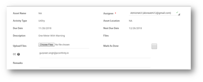 Only the assigned user can update the Utility. User can update only fields enabled for editing like Assignee, Upload Files, email CC, Remarks and Readings and click on Save button.