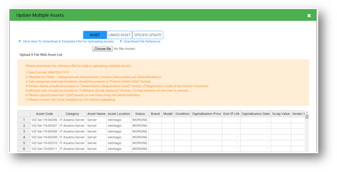 Linked Asset: Linked assets are sub-assets of an asset. To update linked assets for multiple assets, click on Linked Asset button. Further, update parent and child assets.